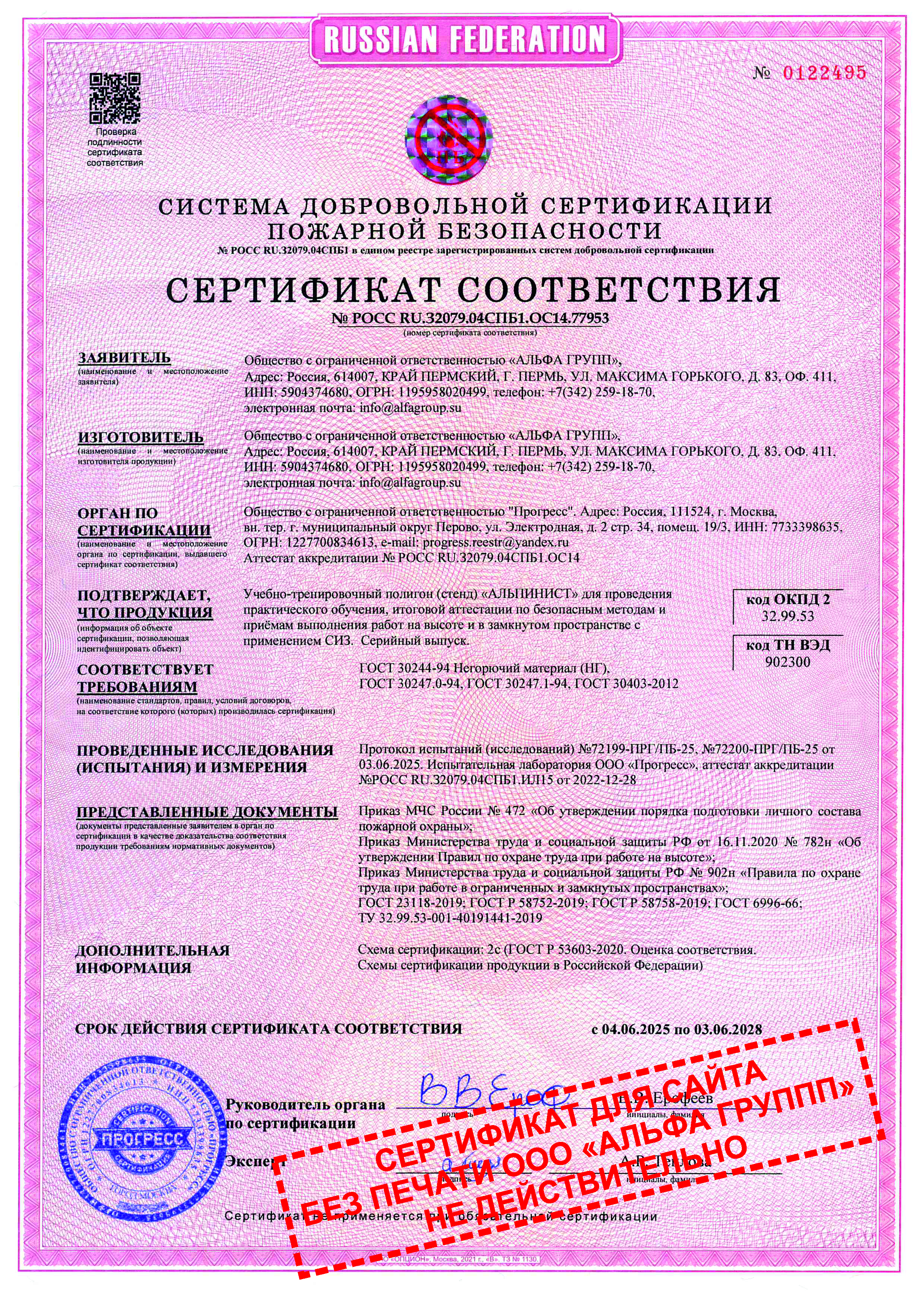 - Учебные комплексы «АЛЬПИНИСТ» сертифицированы и изготавливаются по Техническим условиям ООО «АЛЬФА ГРУПП» Полигон учебно-тренировочный ТУ 32.99.53-001-40191441-2019.